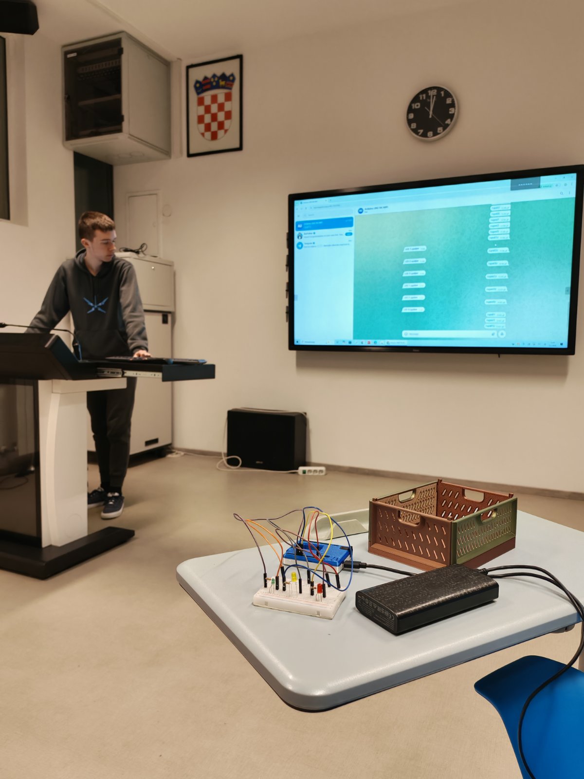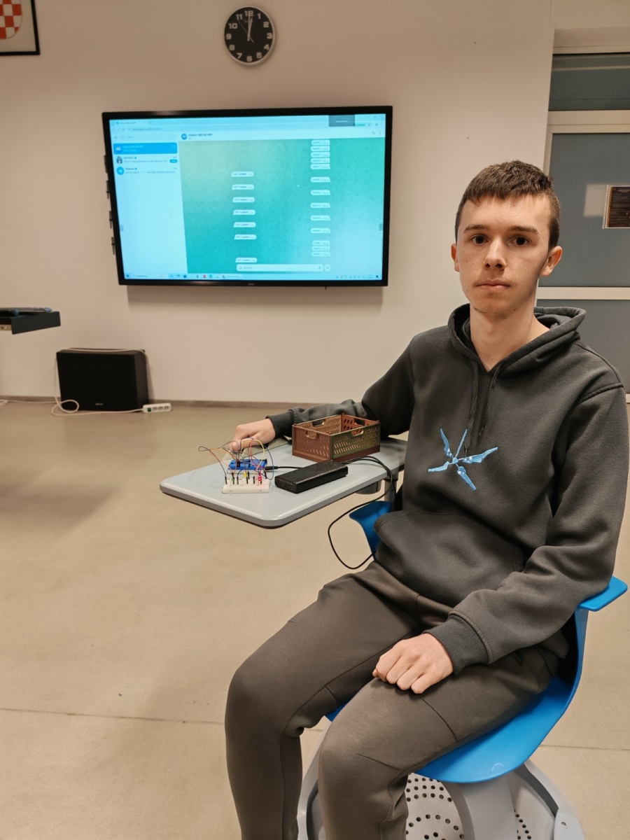 Upravo ovakav primjer upravljanja odlučio je naš učenik 3.T razreda, Emanuel Rohtek, samostalno izraditi i prezentirati na satu predmeta Industrijska automatizacija gdje tehničari u strojarstvu usvajaju znanja i vještine za upravljanje i reguliranje industrijskim procesima.